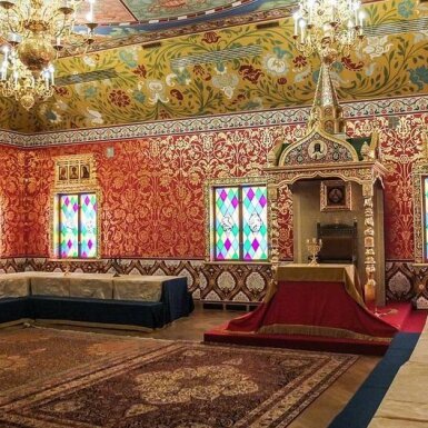 Царь, царица и царские дети размещались в отдельных хоромах, мы побываем на мужской половине: сени, столовая, думная и престольная палаты, кабинет царя, его опочивальня и крестовая палата поражают изысканными интерьерами, сочетающими традиционное для русских домов убранство с привозной "на китайское дело" мебелью.